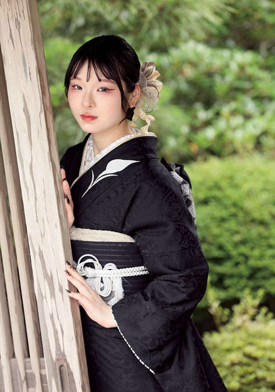 モノトーン系のコーディネートで、シックモダンな装いがとても素敵なお嬢様。笑顔あふれるごきょうだいショットがいいですね。「振袖選びでは、好みの帯を提案してもらえ、小物など細かいところまで決めることができました」。